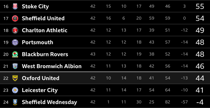 we may finish 4th from bottom but that is still a very successful season and our aim when we kicked of in August ….. personally I think Oxford will reach 48 , Blackburn have a real tough run in and we need Pompey not to lose to Leicester